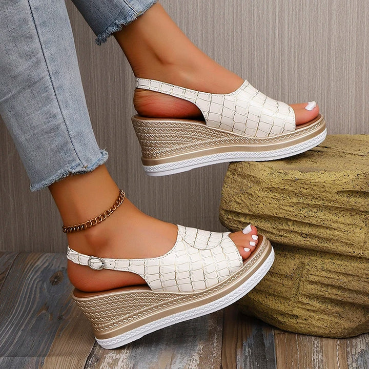 - šćLightweight and comfortablećWe intend to make it soft and comfortable with a unique platform and wedge design. It will support any foot pain when standing or walking for a long time.