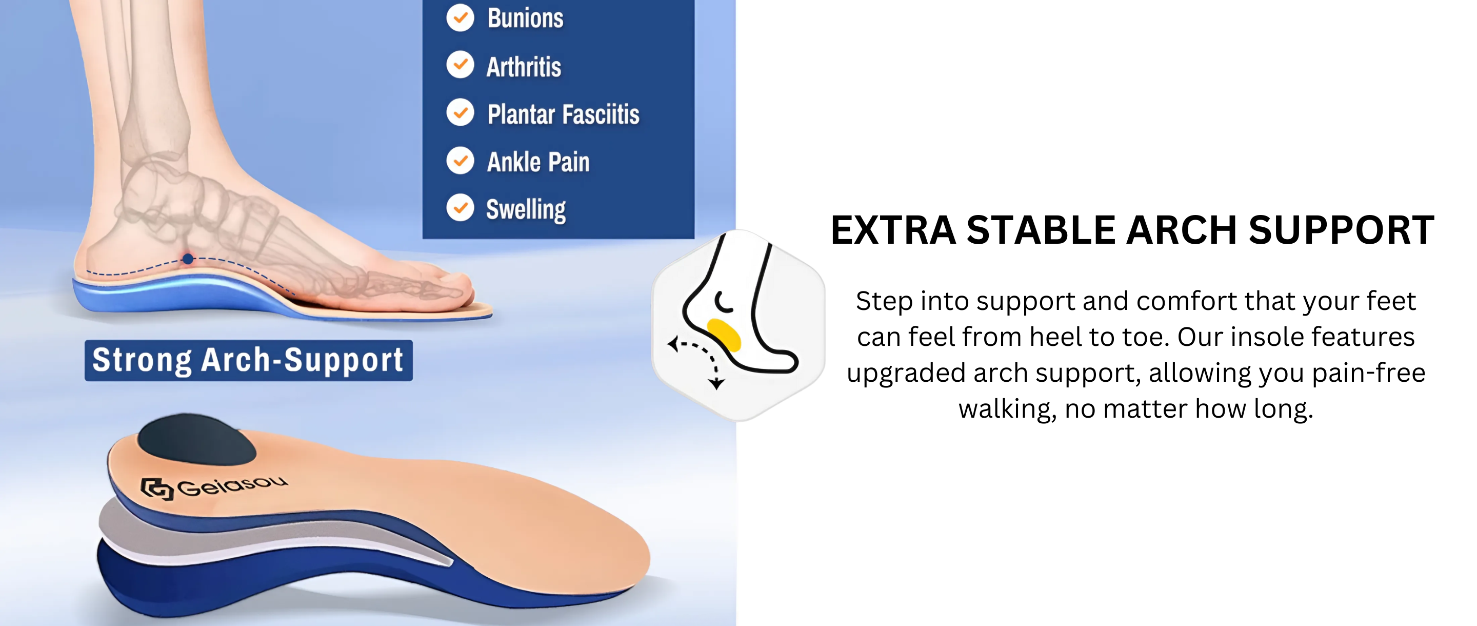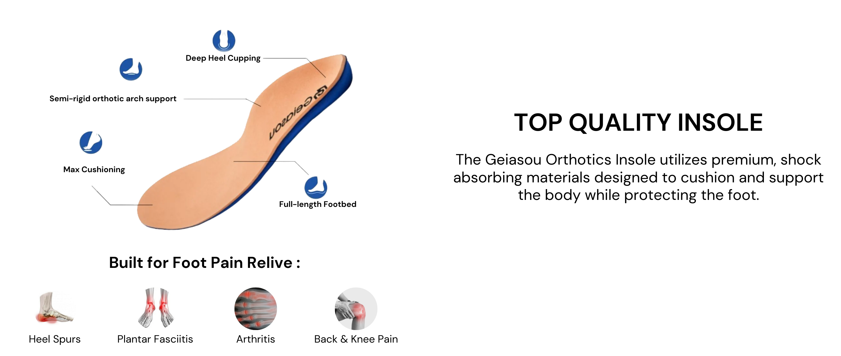 - Arch-support Insole: Provides anatomical support to relieve pain from foot conditions.