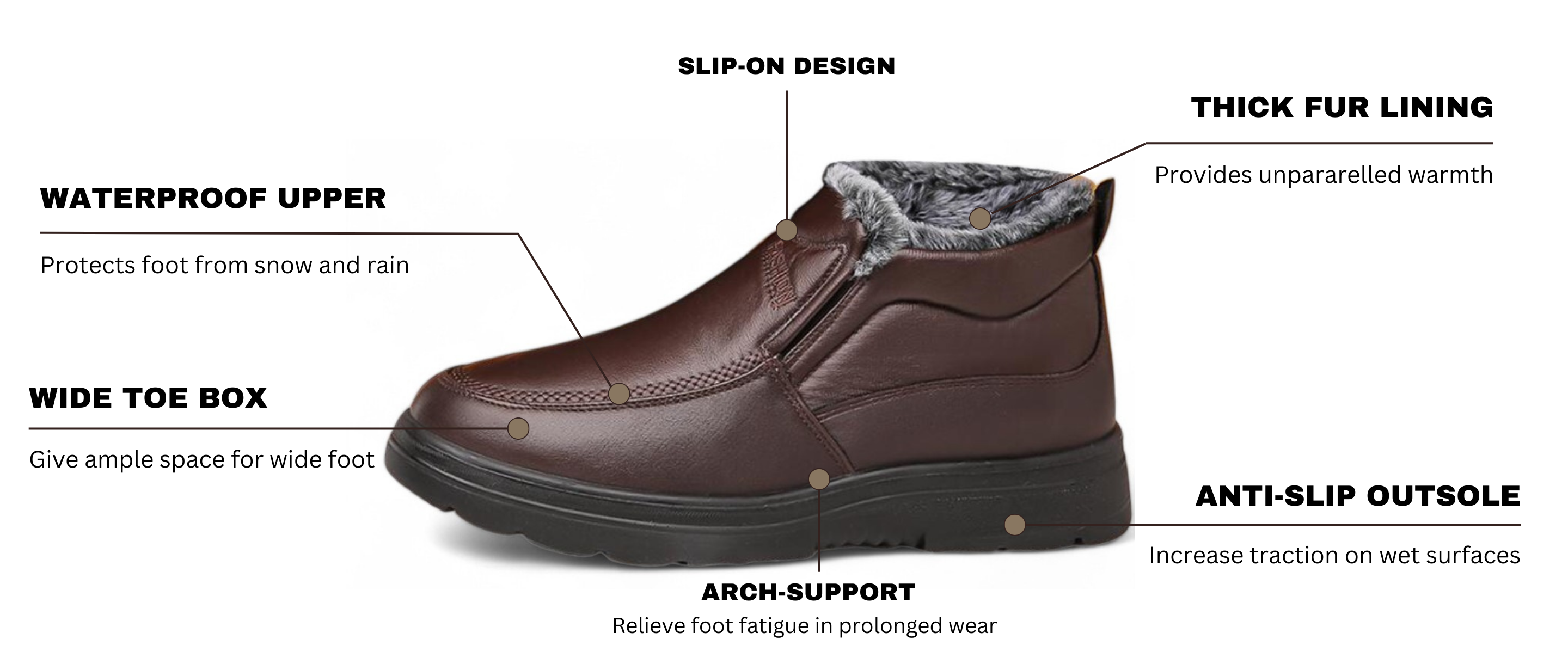 - Waterproof Upper: PU leather ensures feet are dry when walking in snow or rain.