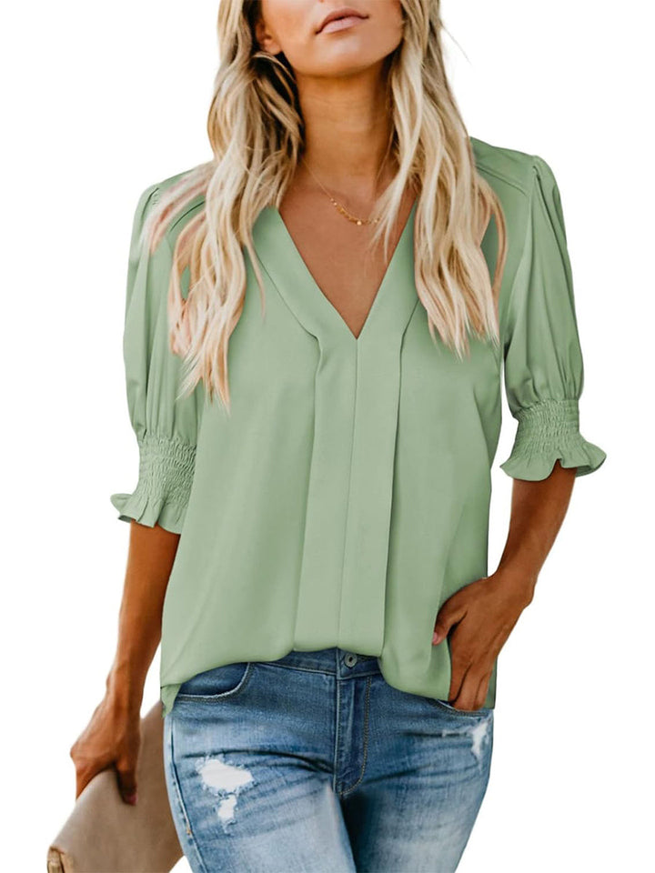 A must have pick for the season! Our V Neck Puff Sleeve Shirts is a simple piece that's perfect for both formal and casual wear. Featuring V Neck and basic short sleeves with cuff detailing, it's adaptable for women of all ages and body types. Also, this business casual blouses makes you look more intellectual and elegant.